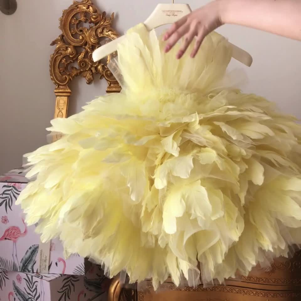This is a luxury floor-length ball gown for toddlers featuring soft yellow goose feathers. The feather bodice is a removable feather jacket that ties in the back, allowing two looks in one. The dress is lined in soft cotton for comfort and designed to make a statement for birthdays, photoshoots, and special occasions.